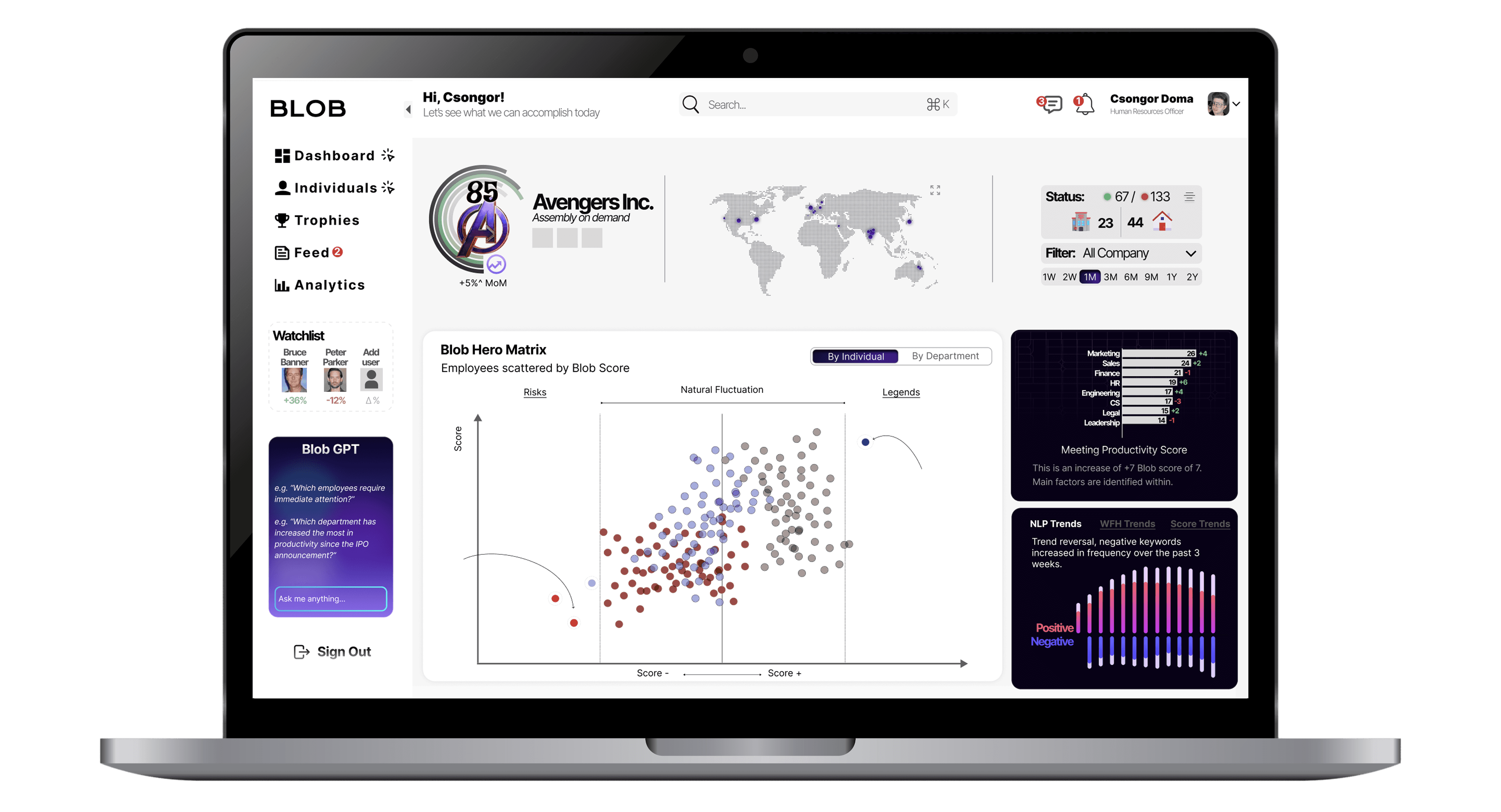 The Blob Score is a hyper-contextual engagement indicator that follows how an employees behaviour changes. It goes much further then just pulling company averages. Our AI-native machine learning digs deep into the persons behaviour, without infringing personal data, and spots changes that are a clear indicators of increasing or decreasing productivity and adjust the score thusly.